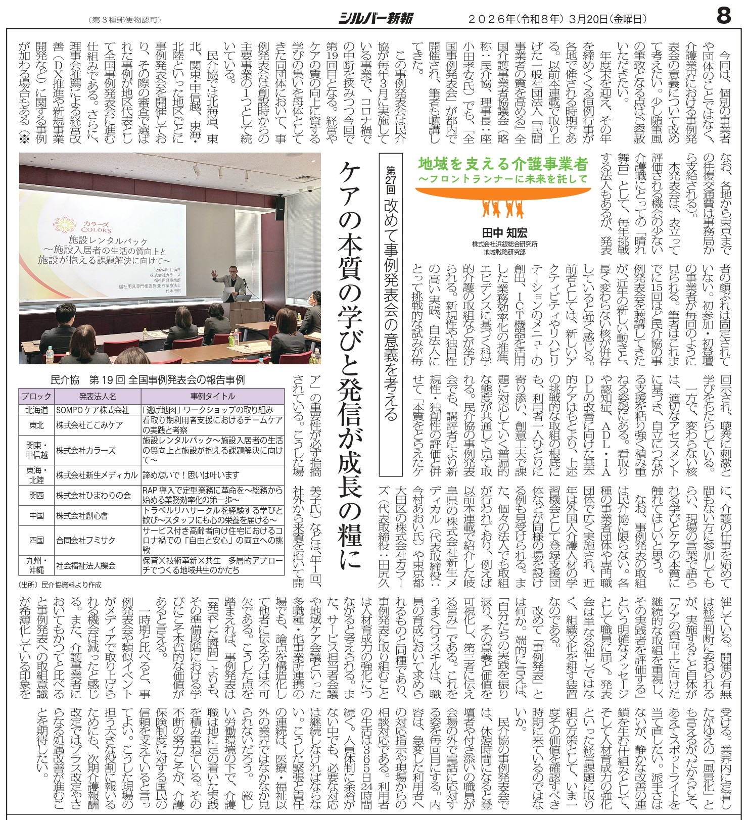 3月20日付のシルバー新報に、一般社団法人「民間事業者の質を高める」全国介護事業者協議会(略称:民介協)が開催した全国事例発表会の様子が紹介されました。